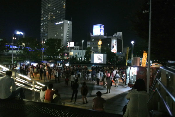 この日は、自走型保護ネコカフェ「ネコリパブリック」が主催するネコ市ネコ座のイベントの日で、駅前で大きなスクリーンで、ネコ動画を上映するので、それを見に行きたくて、お疲れのパパと姫さまに、付き合ってもらいました。