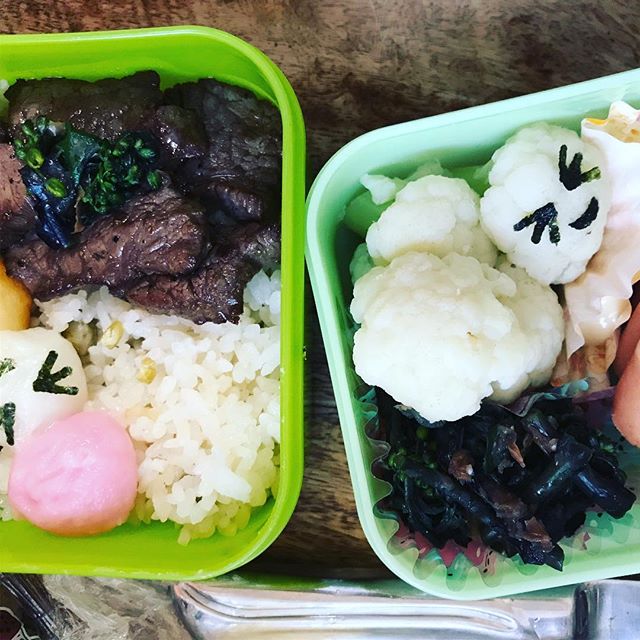 #豆ごはん #焼肉 #菜花のくるみと青しそ和え #3色カマボコ #カリフラワー #チーズインウィンナー #ブドウ #リンゴ