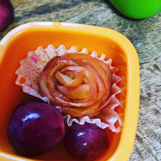 お弁当の日、キャラ弁じゃなくてもいいけど、りんごのデザートは、入れたい!最近、毎日のように、オヤツにリンゴを飾り切りすることにハマっている娘、リンゴでバラを作りました