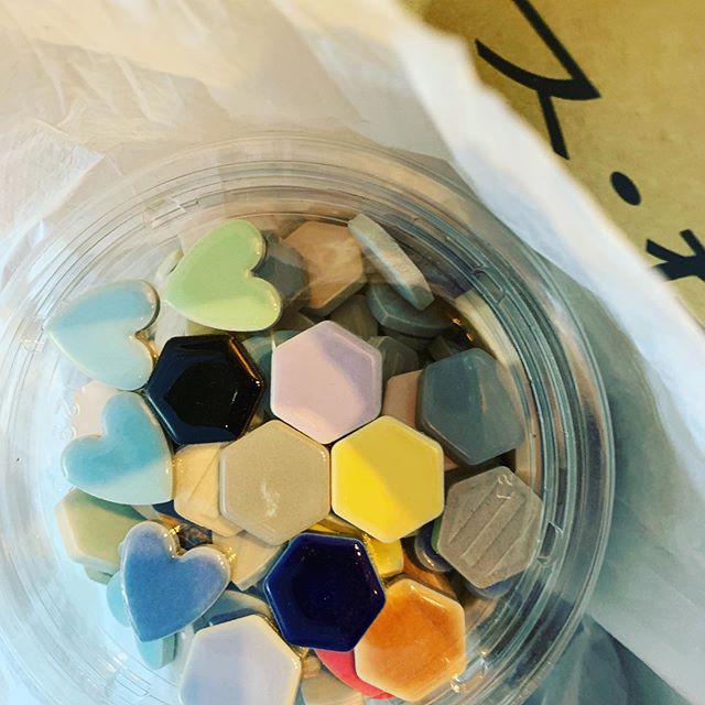 日中は多治見へ行って、アウトレットのモザイクタイルを大量にゲットしてきました。1枚目の箱の中身、名古屋モザイク工業さんのアウトレットセールにて、無料のガラスタイルも大量にいただいて全部で300円(^^)。さすがに可愛いタイルはもう無かったので、丸万商店さんで可愛いタイルを購入しました。大カップ1000円、中カップ500円。フタが閉まれば良いらしい。