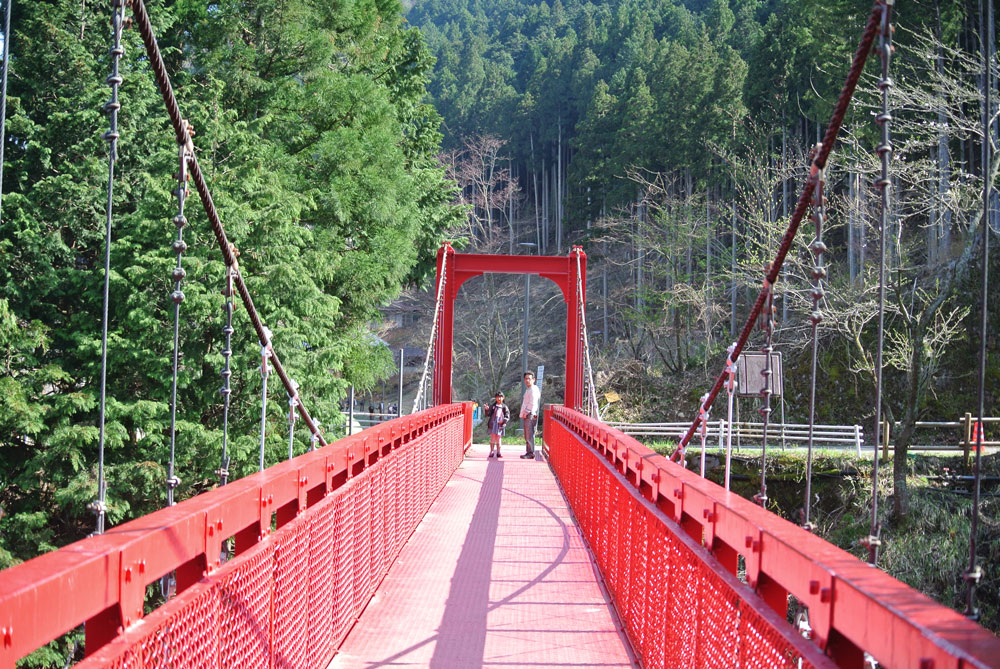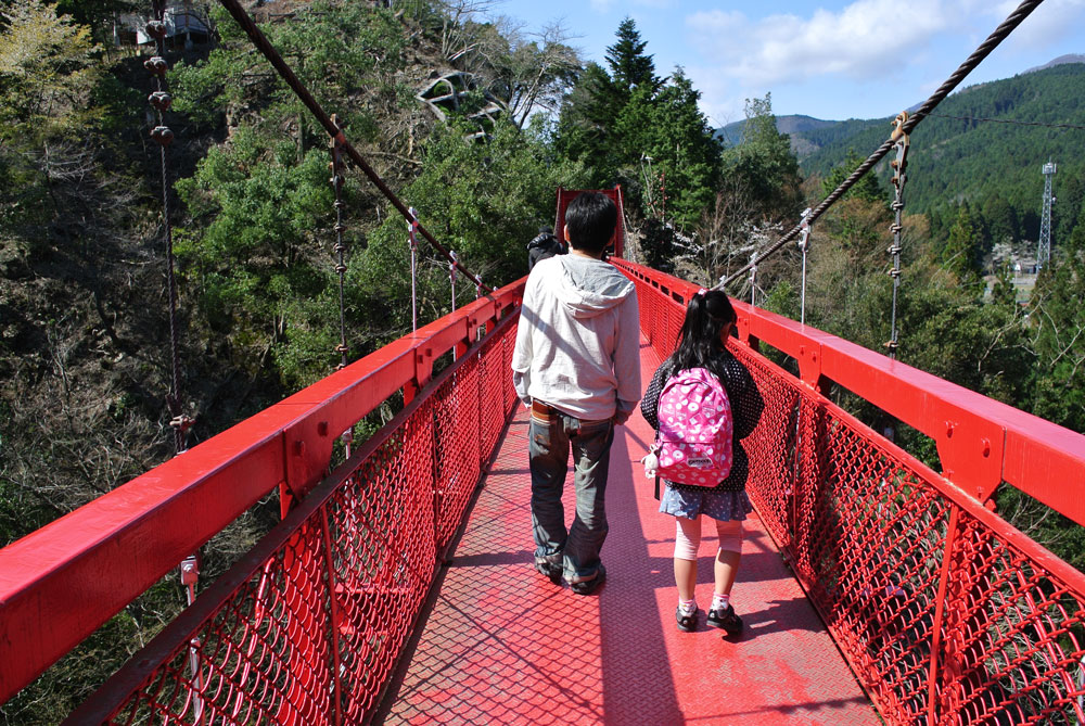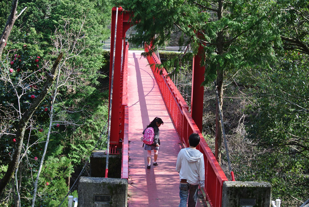 公園の中の池を渡り、奥に進むと、赤い吊り橋が見えてきます。