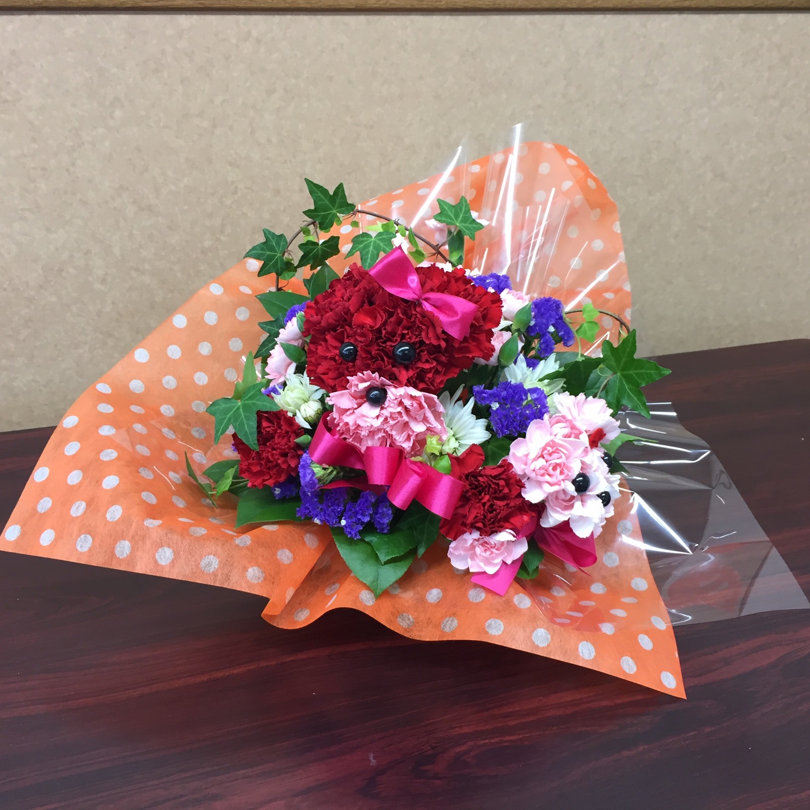 先々週のフラワーアレンジ教室で、作ったテディベア、玄関に、飾っておいたら、帰宅した、姫さまが、かわいいクマさん、と、テディベアを認識してくれました(^∇^)
