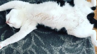 窓辺でポカポカお日様を浴びて、私の足元に来て伸びたまま寝ているアビィくん。あー極楽極楽とつぶやきが聴こえて来そうです。 #ねこすたぐらむ #気持ち良さそうに寝てるけど