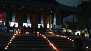 <img src=" class=""> 夜の法要前の竹灯籠、本堂前が綺麗な蝋燭の灯りで彩られています。 19:40頃まで灯しているようです。 #岐阜別院 #竹灯籠